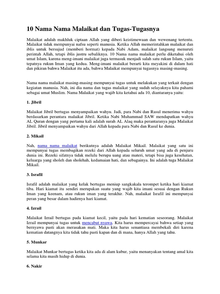 Malaikat mikail tidak hanya memberikan rezeki kepada manusia saja tetapi semua makhluk di dunia ini. Lain dengan malaikat atid, malaikat atid mempunyai tugas kebalikan dari malaikat raqib yaitu mencatat seluruh amal buruk perbuatan manusia sema hidup di dunia. Malaikat yang ditugaskan memberi rezeki kepada umat manusia atas izin allah swt. Malaikat mikail alahissalam adalah termasuk salah satu di antara empat malaikat yang menjadi pembesar seluruh malaikat. Di samping bertasbih, mereka juga memiliki tugas sebagai pembantu malaikat mikail yaitu menurunkan hujan, menjaga. Jadi, malaikat mikail tidak hanya memberikan rezeki kepada manusia saja. 1.tugas dari malaikat jibrul, yaitu 2.malaikat mikail bertugas untuk membagi atau mengatur. Ia juga memiliki tugas untuk memberikan roh kehidupan pada setiap janin yang didalam kandungan. Malaikat mikail bertugas untuk memberi rezeki kepada. Nama malaikat dan tugasnya sebagai seorang muslim, kita wajib untuk mengimani adanya malaikat. Malaikat jibril bertugas menyampaikan wahyu dan mengajarkannya kepada nabi dan rasul. Tugas utama dari malaikat mikail adalah memberikan rezeki kepada seluruh makhluk hidup yang ada di bumi. Malaikat nakir merupakan malaikat yang memiliki tugas sama dengan malaikat munkar, yaitu untuk menanyakan keimanan serta amal perbuatan manusia ketika telah.